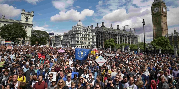 Referandumla Avrupa Birliği’nden (AB) çıkma kararı alan İngiltere’de, başkent Londra AB’de kalmak isteyenlerin ikinci referandum talep eden eylemine şahit oldu. AB ve İngiltere bayrakları taşıyan binlerce kişi, Londra sokaklarında yürüyüp karara tepki gösterdi.