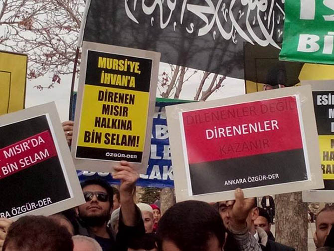 "Esir Edilen Mursi Değil, Mısır Halkının İradesidir", "Dilenenler Değil, Direnenler Kazanır", “Müslüman Zulme Boyun Eğmez”, yazılı dövizler taşındı.