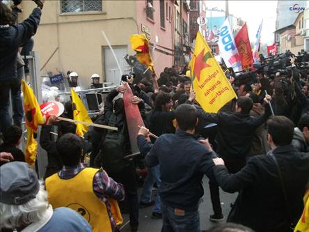 İçerde bunlar yaşanırken dışarısı da hareketlendi. Sanıklara destek için ellerinde Sosyalist Demokrasi Partisi bayraklarıyla gelen bir grup polis arasında arbede çıktı.