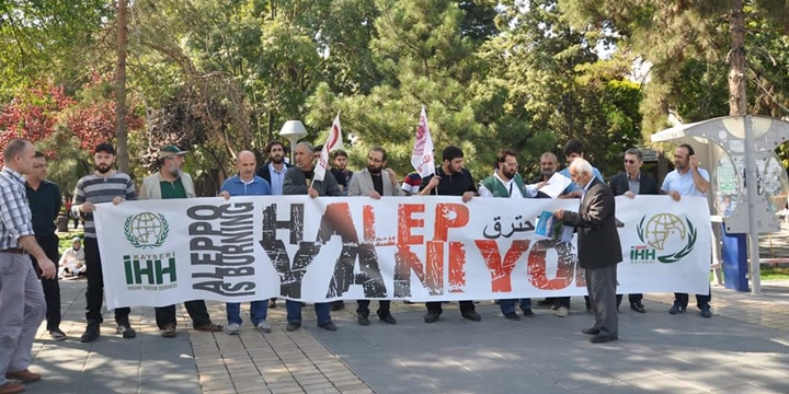 Beşşar Esed, Rusya ve İran’ın oluşturduğu şer ittifakına karşı direnen Halep’e destek olmak için Kayseri Üniversite Gençliği ve Kayseri Genç İHH’nın çağrısıyla toplanan grup, söz konusu şer ittifakının Halep’e yönelik katliamlarını lanetledi.