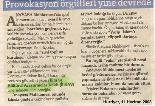 "Anayasa Mahkemesi'nin iptal kararının ardından siyasal İslamcı kesimde sayıları bir hayli fazla olan meczupları "harekete geçirmek için" özel bir provokasyon kampanyası da yürürlüğe sokuldu… Diğer yandan da "Sivil Toplum Kuruluşu" kılığına sokulmuş provokasyon odakları faaliyette. Bu konuda dikkat çeken bir örgüt var. Danıştay saldırısından önce, Danıştay'ın türban ile ilgili kararı için protesto gösterileri yapan İlmi ve Kültürel Araştırmalar Vakfı (İLKAV) yine sahneye çıktı örneğin. Anayasa Mahkemesi önünde izinsiz gösteri yapmalarına polisin seyirci kaldığı bu örgüt, Danıştay bahçesinin parmaklıklarına astığı siyah türbanı bu kez Anayasa Mahkemesi'nin önüne bıraktı. Örgüt, Internet sitesinde de şöyle sesleniyor. "Yargı İslamı Yargılayamaz, Cübbeli Darbeye Direneceğiz!" Sitede Anayasa Mahkemesi, İslama ve İslami Değerlere saldırmakla da suçlanıyor ve üyeleri hedef gösteriliyor. Bu örgüt vakıf statüsünü nasıl kazandı, izaha muhtaç bir durum. Anayasa Mahkemesi üyelerini hedef göstermeleri ve izinsiz gösteri yapmaları ile ilgili nasıl bir takibata maruz kaldılar, bunu merak ettim. İçişleri Bakanı ve Vakıflardan sorumlu bakandan bir yanıt gelirse, sizlere de iletirim."