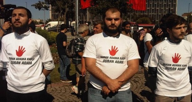Taksim'de birkaç gündür eylem yapan "duran adamlar" eylemi, bir grup tarafından protesto edildi. "Duran adamlara karşı duran adamlar" tişörtü giyen 8 eylemci, Taksim Meydanı'na gelerek eylem başlattı. AKM'ye karşı duran adamların tam karşısında eyleme başlayan grup üyeleri, basın mensuplarını sorularını yanıtsız bıraktı. Bir eylemci gazetecilerin soruları üzerine, "Sorulara cevap vermeyeceğiz. Burada ne amaçla olduğumuzu tişörtler gösteriyor. O yüzden daha fazla soru cevaplamayacağız" dedi.