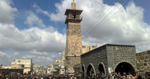 Suriye'de Mart 2011'de Beşşar Esed aleyhine duvar yazıları yazdığı gerekçesiyle bir grup gencin gözaltına alınması ve işkence gördükleri için, ilk olarak Hz. Ömer Camisi çevresinde düzenlenen gösterilerle protesto edilmişti. Çeşitli kentlerde haftalık düzenlenen barışçıl gösteriler daha sonra ülke geneline yayılmıştı. Tarihi Hz. Ömer Camisi, devrimin başlangıcında direnişçiler tarafından bir süre hastane olarak kullanılmıştı.