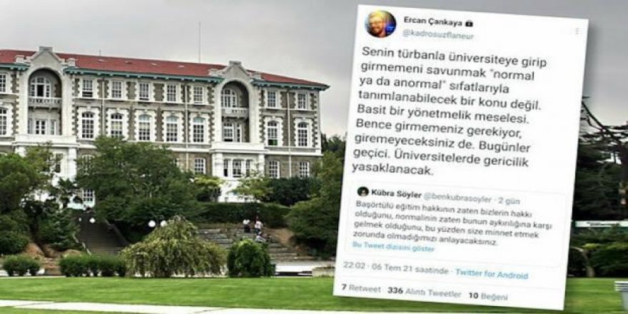 Boğaziçi Üniversitesi Atatürk Enstitüsü doktora öğrencisi Ercan Çankaya, İslam düşmanlığını tüm âleme göstermek istercesine başörtüsüne nefret kustu. Başörtülülerin üniversiteye girmemesi gerektiğini söyleyen müptezel ardından ise bilindik ezber cümleleri sıralıyor: “Senin türban üniversiteye girip girmemeni savunmak ‘normal ya da anormal’ sıfatlarıyla tanımlanabilecek bir konu değil. Basit bir yönetmelik meselesi. Bence girmemeniz gerekiyor, giremeyeceksiniz de. Bugünler geçici. Üniversitelerde gericilik yasaklanacak”