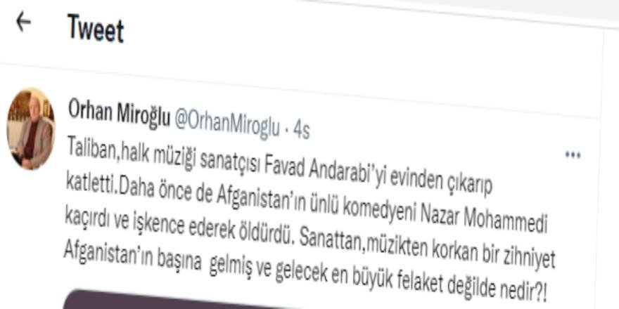 AK Parti MKYK üyesi Orhan Miroğlu, sosyal medya hesabından yaptığı açıklamada, Afganistan’ın halk müziği sanatçısı Favad Andarabi ve sözde komedyen Nazar Muhammed’in Taliban tarafından öldürüldüğünü belirterek sanat ve müzikten korkan bir zihniyetin Afganistan’ın başına gelmiş en büyük felaket olduğunu iddia etti.
