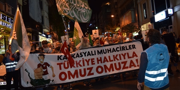 Yürüyüş boyunca sık sık “Dik Dur, Eğilme, Çeçenler Seninle!”, “Kafkasyalı Muhacirler Türkiye Halkıyla Omuz Omuza!” şeklinde slogan atıp tekbir getiren Çeçen muhacirler meydanda büyük tezhüratla karşılandılar.