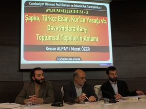 Özgür-Der, aylık panel dizisinin ikincisini “Şapka, Türkçe Ezan, Kur'an Yasağı vb. Dayatmalara Karşı Tepkilerin Anlamı” başlığı ile gerçekleştirdi. Oturum başkanlığını Rıdvan Kaya’nın yaptığı panelin konuşmacıları Kenan Alpay ve Murat Özer’di.