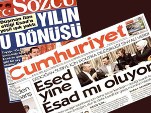 Cumhuriyet gazetesi bugün “Esed yine Esad mı oluyor?” manşetiyle çıkarken; Sözcü konuyu “Yılın U Dönüşü” (Düşman ilan ettiği Esad’a yeşil ışık yaktı) başlığıyla manşete çekti. Zaman gazetesi de yine birinci sayfadan sanki nötr ifadeler aktarıyormuş gibi; “Esedli geçiş olabilir” başlığını tercih etti. Zaman’ın diğerlerinden farkı içerikte sözlerin devamının yer almasıydı.