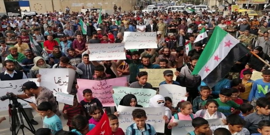 AA’nın aktardığına göre, protestocular, Suriye Milli Ordusu’na çağrıda bulanarak, Esed rejiminin şehirden çıkarılması ve YPG/PKK’nın bölgeden temizlenmesini istedi.