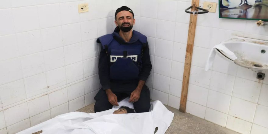 Haber görseli: Filistinli kameraman Mohammed Alaloul, 5 Kasım 2023'te Gazze Şeridi'nin orta kesimindeki Al-Maghazi mülteci kampına düzenlenen İsrail saldırısında hayatını kaybeden oğlunun cesedi başında aynı şehirdeki Al-Quds hastanesinde yas tutuyor (AFP)
