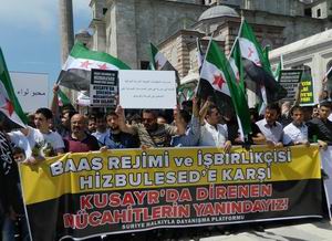 Murat Ayar’ın sunumunu yaptığı eylemde “Katil Esed ve İşbirlikçileri; Banyas’tan, Reyhanlı’ya Döktüğünüz Kanların Hesabını Vereceksiniz!”, “Baas Rejimi ve İşbirlikçisi HizbulEsed’e Karşı, Kusayr’da Direnen Mücahitlerin Yanındayız!”, “Baasın Safında Duranlar, Ümmetle Aynı Safta Olamazlar!”, “Yaşasın Suriye Direnişimiz!” yazılı pankartlar açılırken “Yazıklar Olsun Sana Ey Nasrallah, İsrail Karşısında İftiharımızdın, Suriyeli Mazlumlara Karşı Utancımız Oldun!”, “Baas Zulmüne ve HizbulEsed İhanetine Karşı, Kusayr’da Direnen Mücahitlere Bin Selam!”, “Suriye İslami Direnişle Özgürleşecek!”, “Sessiz Kalmak Baas’ın Suçuna Ortak Olmaktır!”, “Baas Çöplüğe Esed Sehpaya!”, “Esed Canavarını Durdurun!” yazılı dövizler taşındı.