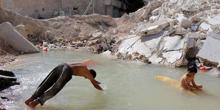 Halep'te park alanlarını kaybeden çocuklar, Rus bombardımanlarının açtığı derin çukurlara biriken sularda oynuyor.