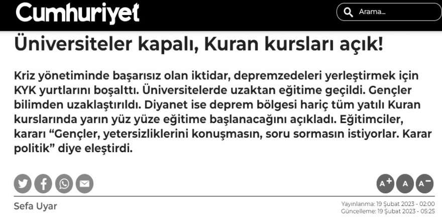 Burada tutarsızlık sadece Cumhuriyet ile sınırlı değil tabi ki… “Üniversiteler kapalı, Kuran kursları açık!” başlıklı haberde Cumhuriyet saçmalamanın sınırlarını zorlamış. Üniversitelerin uzaktan eğitime geçmesi başta barınma ihtiyacı düşünülerek yurt kapasiteleri sebebiyle alındı. Yine de bu karar tartışılabilir. Başka bir çözüm önerisi olan varsa buna göre bir düzenleme yapılabilir. YÖK de zaten kararın Nisan ayında tekrar gözden geçirileceğini duyurdu.