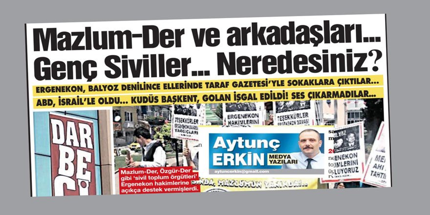 Sözcü Gazetesi yazarı Aytunç Erkin de bugün aynı minvalde bir yazı yazmış. Ergenekon ve Balyoz davaları sürecinde darbeci Kemalist zihniyeti teşhir eden eylemleri nedeniyle İslamcı ve liberal çevreleri hedef almış. Mazlumder, Özgür-Der, Hukukçular Derneği ve Genç Siviller’in bu süreçte çok aktif olduğunu, eylemler yaptığını söyleyen yazar aynı çevrelerin ABD-İsrail ortaklığıyla kotarılan Kudüs ve Golan adımları karşısında ise sessiz kaldığını iddia etmiş. Buradan kalkarak sol-Kemalistlerin bayatlamış “ABD işbirlikçisi gericiler” söylemini tekrar etmiş.