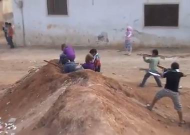 Daha önce katledilmiş onlarca Suriyelinin toplu mezara gömüldüğü görüntüleriyle de bilinen İdlib’in Taftanaz köyünde oynanan bir oyun oldukça dikkat çekici. Çocukların nasıl bir psikoloji içerisinde büyümek zorunda bırakıldıklarının çok net bir göstergesi.