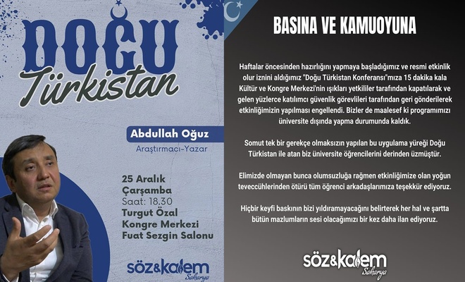 Sakarya Üniversitesi Söz ve Kalem Öğrenci Topluluğu, günler öncesinde yapmayı planladığı ve duyurusunu da sosyal medya mecralarında yaptığı "Doğu Türkistan" konferansı, rektörlükten tüm gerekli izinler alınmasına rağmen programa 15 dakika kala hiçbir gerekçe gösterilmeden iptal edildi.