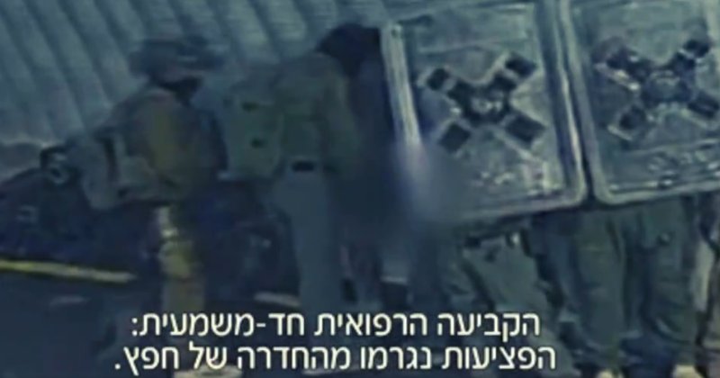 Bazı askerlerin alıkonulan Filistinliye işkence yaparken diğer askerlerin kalkanları kullanarak o anların güvenlik kamerasınca kaydedilmesini engellemeye çalıştığı görülebiliyor.