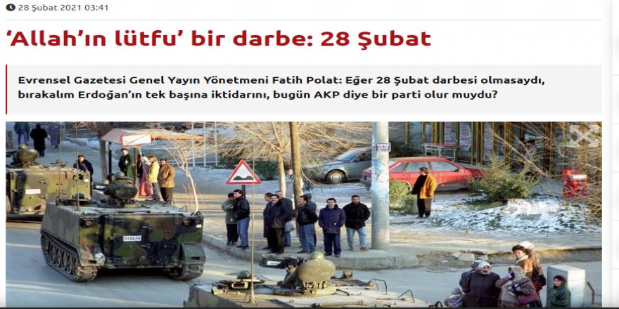 Açıkçası solun manipülasyon gücü ve algı oluşturma beceresi atlanarak bu mesele değerlendirilemez. Yani sol-Kemalistler 28 Şubat’a karşı çıkıyorlarsa bir de ‘alt metne’ bakmak lazım gelebilir. Örnek olarak Evrensel gazetesinin manşeti incelenebilir. Evrensel Gazetesi Genel Yayın Yönetmeni Fatih Polat, ‘Allah’ın lütfu’ bir darbe: 28 Şubat başlıklı yazısında 28 Şubat için menfi anlama gelebilecek sadece ‘darbe’ tanımlamasını yapıyor. Yazının içeriğinde cuntacıların Müslümanlara yaptıkları zulümlerden tek kelime ile bahsedilmezken netice olarak 28 Şubat’ın Erdoğan üzerinden dindarlara yaradığı algısı oluşturulmaya çalışılıyor. Polat şöyle soruyor: “Eğer 28 Şubat darbesi olmasaydı, bırakalım Erdoğan’ın tek başına iktidarını, bugün AKP diye bir parti olur muydu?”