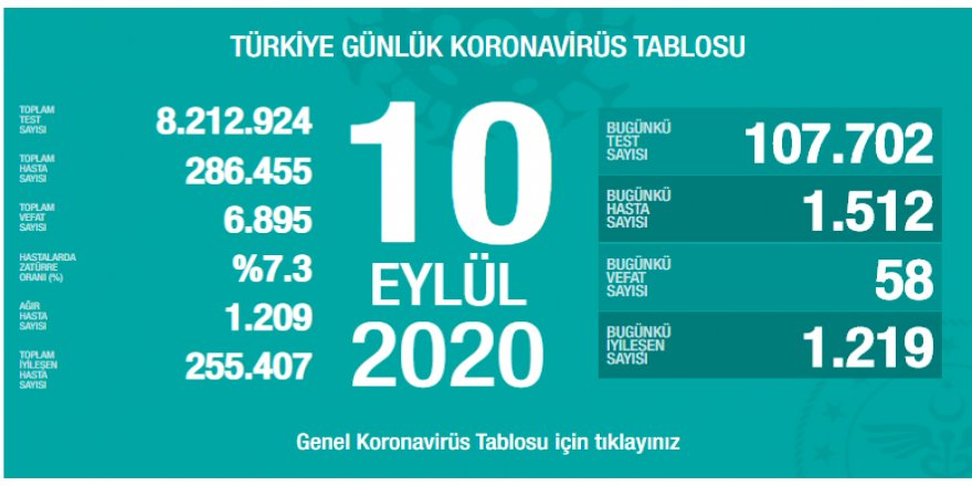 Sağlık Bakanlığı Türkiye'nin günlük koronavirüs tablosunu açıkladı. 10 Eylül Perşembe gününün verilerine göre 58 kişi hayatını kaybederken bin 512 vaka tespit edildi.