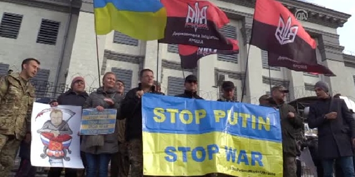 Ukrayna’nın başkenti Kiev’de, Rusya’nın Kiev Büyükelçiliği önünde toplanan bir grup aktivist, Suriye’de ve Ukrayna’nın doğusundaki savaşın durmasını istedi.