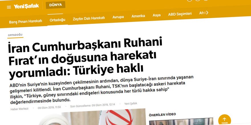 Yeni Şafak ise ilginç bir şekilde Ruhani’nin mesajını kırpmış ve İran’ın Türkiye’nin operasyonunu desteklediği sonucu çıkartılacak bir haberi sayfalarına taşımıştı.