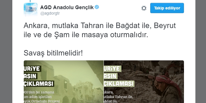 Anadolu Gençlik Derneği (AGD) son günlerde Halep’te yaşanan katliamlar hakkında yaptığı açıklamada Ankara’ya Tahran, Bağdat, Beyrut ve Şam ile masaya oturmasını tavsiye ediyor. Bu açıklamalardan anlaşılan bağlı oldukları partinin eski genel başkanı Mustafa Kamalak’ın Şam’da Suriye halkının katili Beşşar Esed’i ziyaret etmesine benzer bir tavrı hükümetten beklemekteler.
