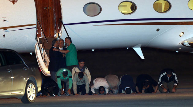 Uçaktan indikten sonra zafer işareti yapan Filistinliler, uçağın merdivenleri önünde 'şükür secdesi' yaptılar. Buradan 2 ayrı araca alınan Filistinliler, eskortlar eşliğinde havaalanından ayrıldı.