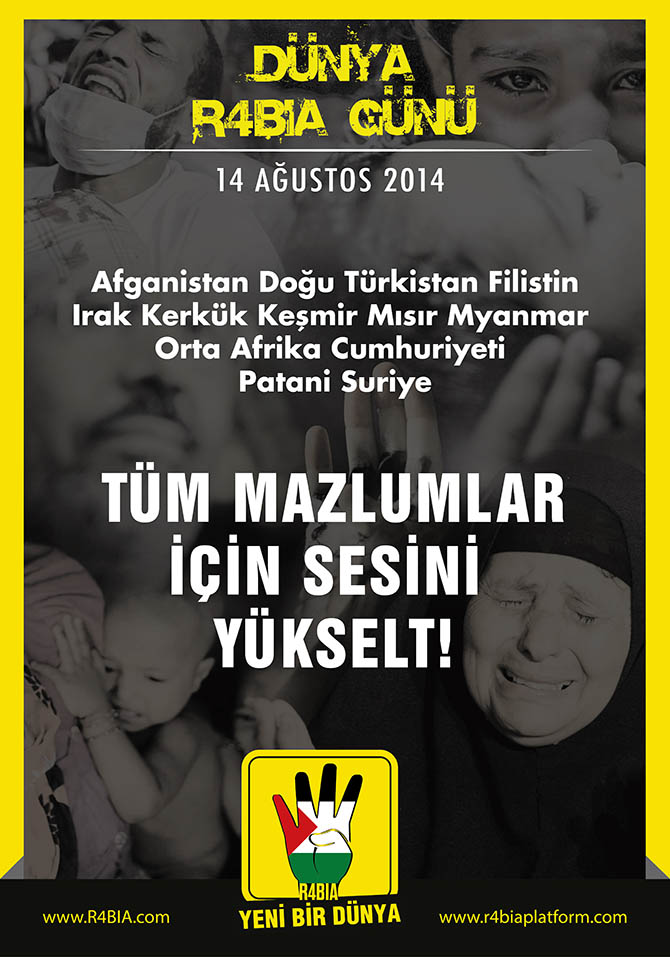 Her 14 Ağustos’ta dünya mazlumları sizin zulmünüzü konuşacak. Dünya R4BIA Günü’nde Sisi’nin, Fahd’ın, Netanyahu’nun, Esed’in, Obama’nın, Putin’in, Ruhani’nin yaptığı/destek verdiği katliamları, zulmü anlatacağız.