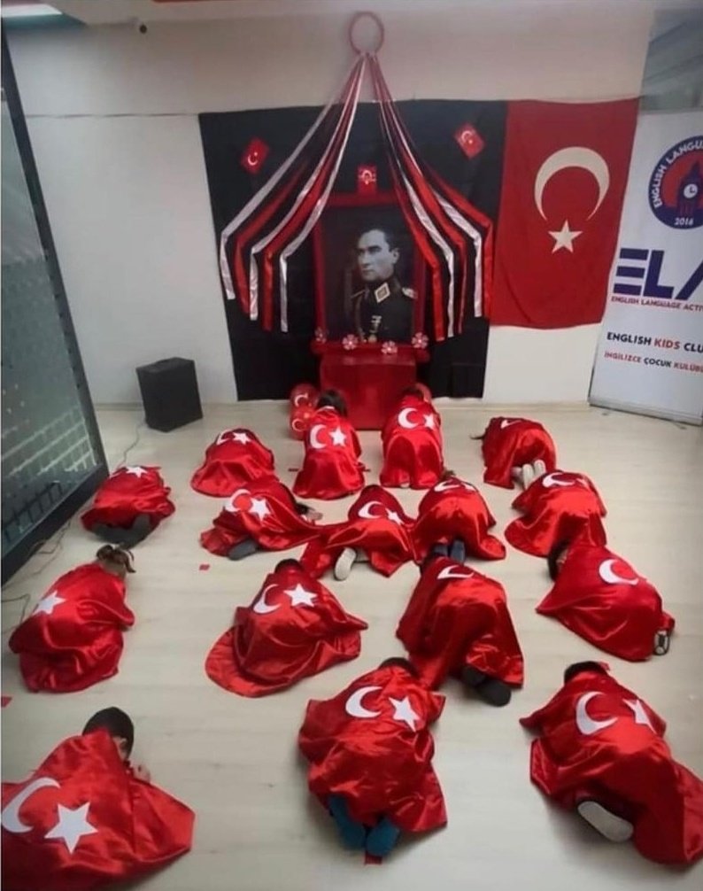 Sosyal medyaya düşen görsellerden İstanbul Silivri’deki Hasan Özvarnalı İlkokulu ve Beşiktaş’taki Ela Kids Anaokulu’nda gerçekleştirildiği anlaşılan 29 Ekim törenlerinde büst önünde secde ritüelleri sergilendi.