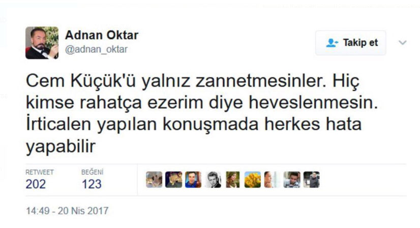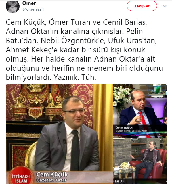 Adnan Oktar ve başında bulunduğu şebekeye dair söylenecek çok şey var elbette. Ancak Oktar’ın İsrail’le ilişkiler çerçevesinde geliştirdiği ilişkilerde dikkat çekici bazı isim ve çevrelerle enteresan ortak noktaları bulunuyor. Bunlardan biri hiç şüphesiz Türkiye Gazetesi yazarı ve TGRT’de Fuat Uğur’la birlikte program yapan Cem Küçük’tür. Pelikan Yalısı’nın müdavimlerinden olan Cem Küçük ve Fuat Uğur, gibi isimler Cumhurbaşkanı Erdoğan’ın tanımıyla “ahlaksız troller” olarak tanınıp biliniyor piyasada. (İlginçtir Adnan Oktar grubuna yönelik operasyonu başladığı saatlerde Cem Küçük-Fuat Uğur ikilisi sosyal medya hesaplarını askıya almışlardı.)