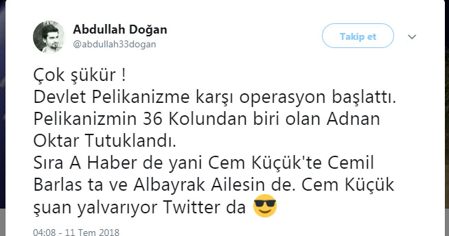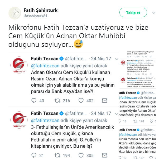 Çok sonraları geriye doğru arşiv taramaları yapıldığında görülüyor ki Pelikan Yalısı’nın müdavimleri Adnan Oktar’ın A9TV’sini neredeyse suyoluna çevirmişler meğer. Hatta o programlardan birinde en alakasız mevzular için dahi Cem Küçük şöyle referanslar vererek Adnan Oktar’a saygı ve sadakatini deklare ediyordu: “Hocamız Adnan Oktar da birçok defalar konuşmalarında, konferanslarında bunları dile getiriyordu.” Kirli ve karanlık ilişkilerin hemen tamamını örten bir maske olarak kullanılan “reisçilik” ve “Fetö’yle mücadele” bir bakıyorsunuz Adnan Oktar ve şebekesiyle sıklaştırılan saflara hızla dâhil olmak, aynı hedeflere iştiyakla birlikte vurmak için de kolaylaştırıcı bir vesile oluyordu.