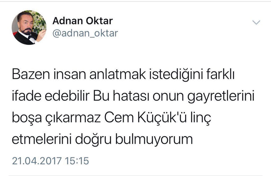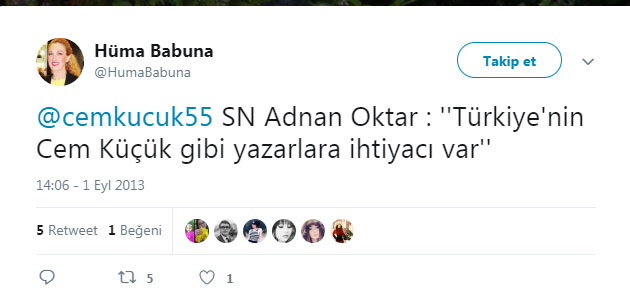 1antv’den etrafa saçılan “Mavi Marmara’daki manyak tipler” kusmuğundan sonra Cem Küçük’e haklı olarak pek çok tepki yöneldi, davalar açıldı, protestolar düzenlendi. Bu süreçte hemen kimse Cem Küçük’e sahip çıkamadı, tabii Adnan Oktar ve ekibi hariç. Oktar’ın ilk anda verdiği beyan şöyleydi: “Yalnız filan zannetmesinler, bir daha söylüyorum, kimse densizlik yapmaya kalkmasın. Cem Küçük’e dokunanın kolunu bacağını kırarız. O delikanlının kılına tüyüne dokundurtmayız. Gördüğünüz görmediğiniz bayağı bir destekçisi var. Görünmeyenler görünenlerin yüz mislidir. Cem Küçük dürüst bir delikanlı, hiçbir menfaati olmadan belaların içine girmiştir.” Aynı süreçte Adnan Oktar şebekesinin Hüma Babuna gibi önemli isimleri devreye giriyor ve “Türkiye’nin Cem Küçük gibi yazarlara ihtiyacı var.” Mesajıyla durdukları yer net olarak ilan ediyorlardı.