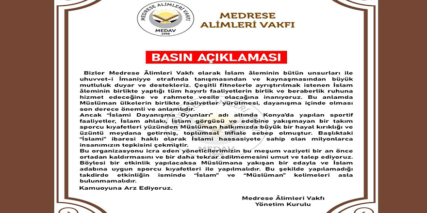 Medrese Alimleri Vakfı, İslami Dayanışma Oyunları'nda İslam ahlakının gözetilmesi gerektiğini belirtti