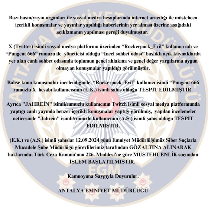 Antalya Emniyet Müdürlüğü, sosyal medyada Jahrein olarak bilinen Ahmet Sonuç'un gözaltına alındığını ve kendisine müstehcenlik suçundan işlem başlatıldığını duyurdu. Jahrein'in Twitch yayınında eşinin kız kardeşiyle ilgili söyledikleri sosyal medyada tepki çekmişti.