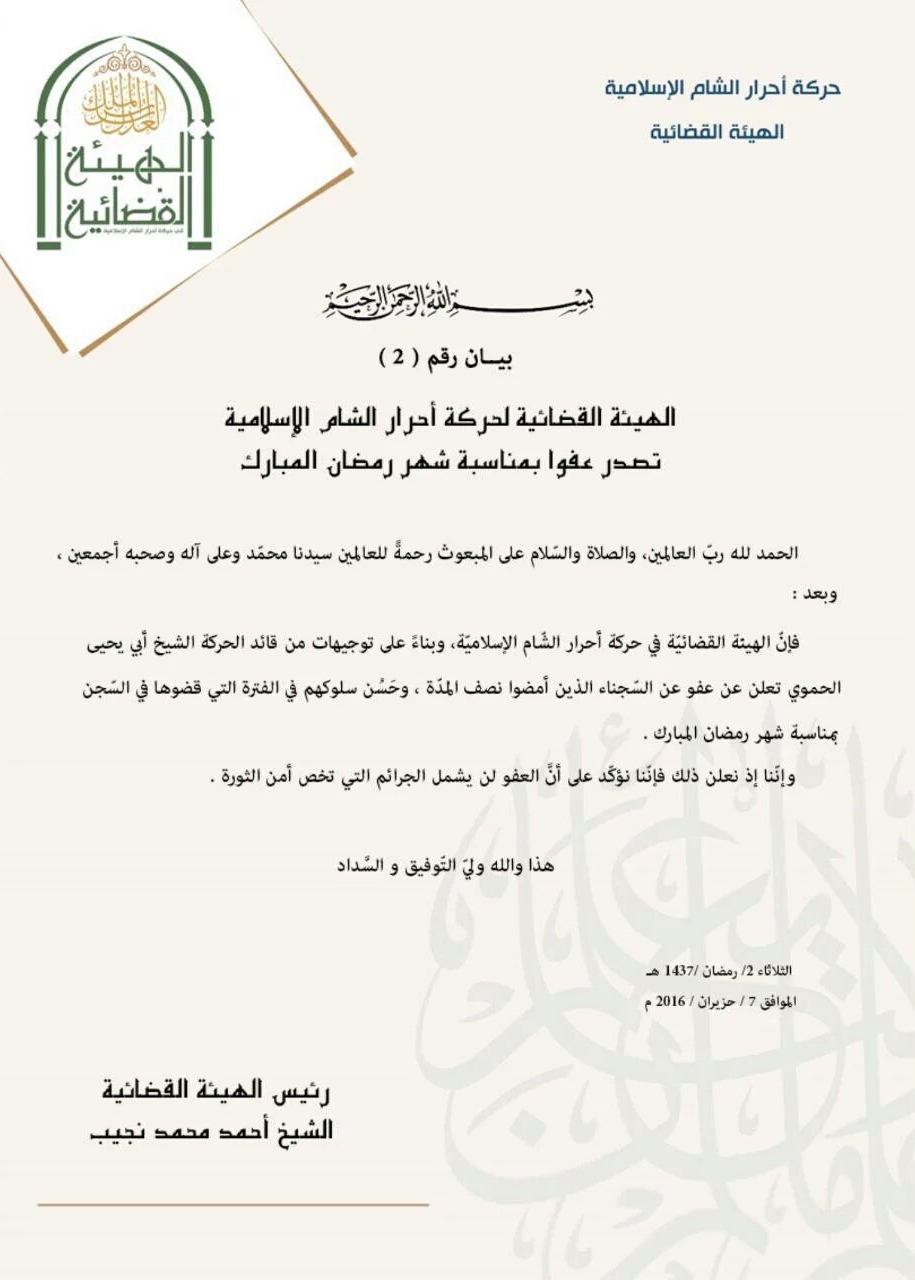 Ahraru’ş-Şam Mahkeme Heyeti’nin Ramazan Ayı’nın ikinci günü yayımlamış olduğu beyanatta Ahraru’ş-Şam Lideri Şeyh Ebu Yahya el-Hamevi’nin talimatına binaen hapiste cezasının yarısını yatmış ve hapiste kaldığı bu süre içerisinde davranışları iyi olanların Ramazan Ayı münasebetiyle affedildiğini duyurdu.