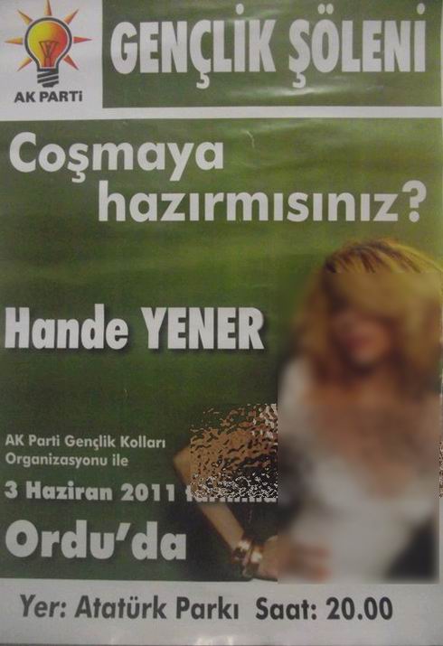 AK Parti Ordu teşkilatının 3 Haziran'daki Gençlik Şöleni'ne müstehcen dansları eşliğinde söylediği şarkılarla bilinen Hande Yener davet edildi. Hazırlanan afişte ise "Coşmaya hazır mısınız?" ifadesi dikkat çekti.