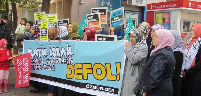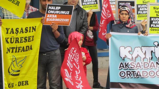 Eylemde “Katil İsrail Aksa’dan, Filistin’den ve Ortadoğu’dan Defol!”, “Siyonist İşgale ve İşbirlikçilerin İhanetine Karşı Kudüs'te Direnen Kardeşlerimizin Yanındayız! Yaşasın Aksa İntifadası” yazılı pankartlar açıldı. “Halep Onurumuz Aksa Şiarımızdır!” “Siyonist İşgale Son! Kudüs'e ve Aksa'ya Özgürlük!” “Kudüs İslam Ümmetinindir!” yazılı dövizler taşındı. Tevhid bayraklarının açıldığı eylemde “Mescidi Aksa Onurumuzdur!” “Katil İsrail Filistin’den Defol”, “Halep’e Kudüs’e Direnişe Bin Selam!”, “Kudüs’e Selam Direnişe Devam”, “Yaşasın Küresel İntifada”, “Müslüman Uyuma İlk Kıblene Sahip Çık”, “Akhisar’dan Kudüs’e Direnişe Bin Selam” sloganları atıldı ve tekbir getirildi.