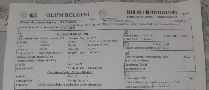 Ozada hanımın düşük yaptığına dair ölüm belgesi.