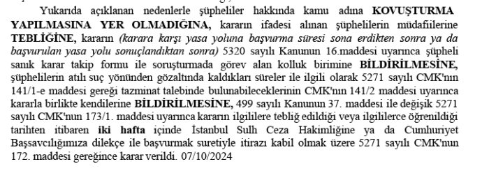 Ozada hanım taraf olmadığı, baba Shodi beyin adının geçtiği dosyaya dair verilen takipsizlik kararı.