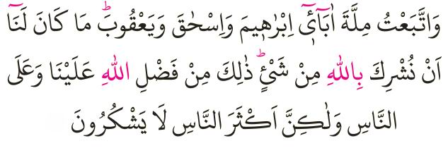 "Atalarım İbrahim'in, İshak'ın ve Yakub'un dinine uydum. Allah'a herhangi bir şeyi şirk koşmamız bizim için olacak şey değildir. Bu, bize ve insanlara Allah'ın lütuf ve ihsanındandır, ancak insanlardan çoğu şükretmezler." (Yusuf-38)