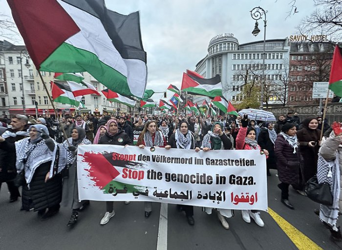 Berlin'de Filistin destekçisi yaklaşık 1000 kişi, İsrail'in Gazze ve Lübnan'a yönelik saldırılarını protesto etmek için Wilmersdorfer Strasse metro istasyonunun yakınında toplandı.