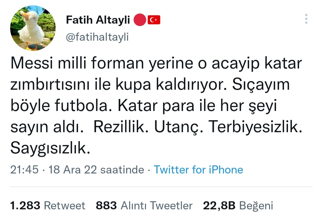 Fatih Altaylı sosyal medya hesabından yaptığı paylaşımında: "Messi milli forman yerine o acayip katar zımbırtısını ile kupa kaldırıyor. Sıçayım böyle futbola. Katar para ile her şeyi sayın aldı. Rezillik. Utanç. Terbiyesizlik. Saygısızlık." diyerek hakaret içeren ifadeler kullandı.