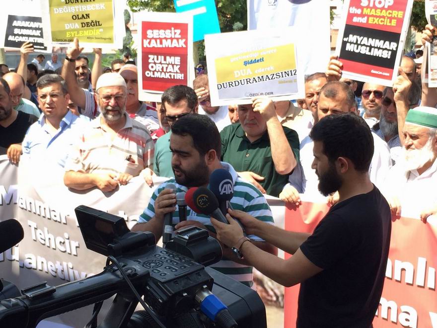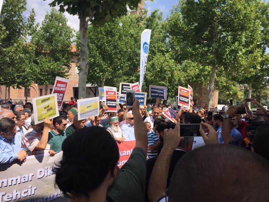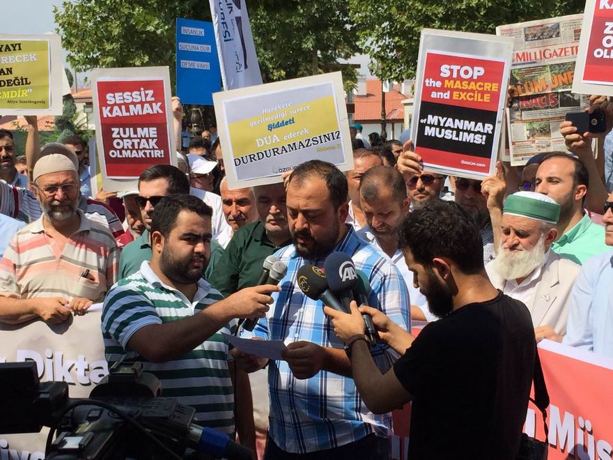 Basın açıklamasında “Müslüman uyuma kardeşine sahip çık”, “Budistler yakıyor dünya uyuyor”, “Kahrolsun katiller zulme susan hainler” sloganları atıldı. Topluluk “Arakanlı Müslümanlar Kınama ve Ağıt Değil Çözüm Bekliyor”, “Budist Myanmar Diktasının Katliam ve Tehcir Zulmünü Lanetliyoruz” pankartları açıp, “Dünyayı değiştirecek olan dua değil eylemdir.”, Arakan’a Susmak Alçaklıktır”, “Sessiz Kalmak Zulme Ortak Olmaktır”, “Kardeşine Sahip Çık” dövizleri taşıdılar.