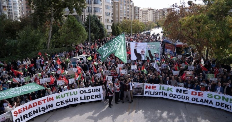 Daha sonra binlerce “Şehit Yahya yolun yolumuz”, “Bir Yahya gider bin Yahya gelir”, “Katil İsrail, Katil Amerika” sloganları eşiliğinde ABD Büyükelçiliği önüne yürüdü.