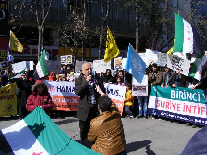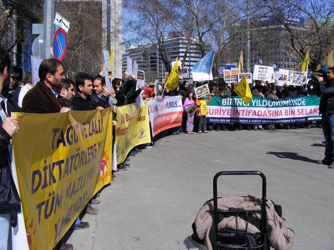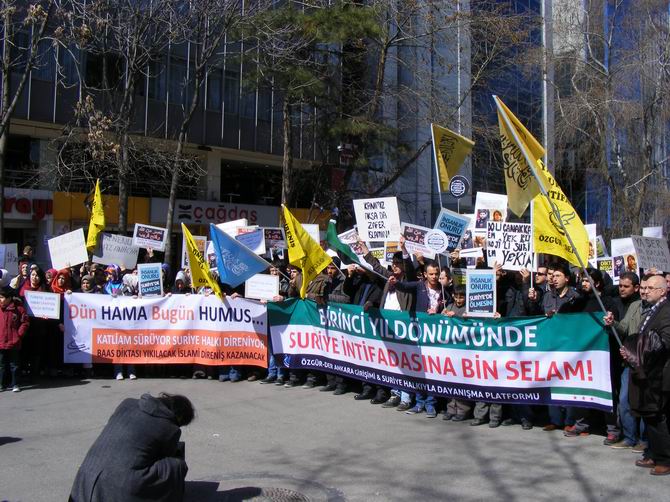 Ankara Özgür-Der Girişimi ve Suriye Halkıyla Dayanışma Platformu Kızılay Güvenpark’ta Suriye İntifadasının 1. yıldönümü münasebetiyle saat 13.00’te bir protesto eylemi düzenledi.