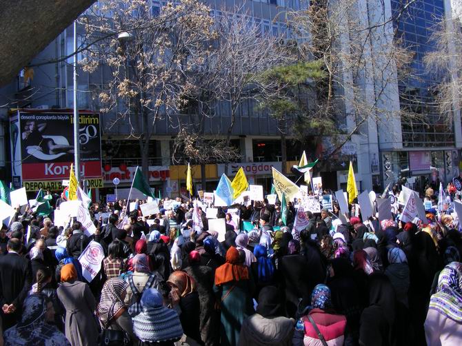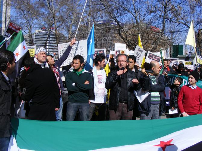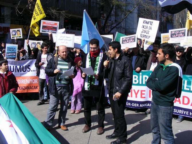 “Birinci Yıldönümünde Suriye İntifadasına Bin Selam”, “Dün Hama, Bugün Humus, Katliam Sürüyor Suriye Halkı Direniyor”, “Baas Diktası Yıkılacak, İslami Hareket Kazanacak”, “İnsanlık Onuru Suriye’de Ölmesin”, “Allah’ın Yardımıyla Zafer Yakındır”, “Diktatör Beşşar Esad, Katliam Zulüm Fesat”, “Golon İşgal Altında, Esad’ın Tankları Dera’da Hama’da Humus’ta” pankart ve dövizleriyle basın açıklaması alanını dolduran yaklaşık 500-600 kişi; “Suriye Halkı Yalnız Değildir”, “Diktatörler Yenilecek İslami Direniş Kazanacak”, “Yaşasın Küresel İntifada”, “Suriye’ye Özgürlük Direnişle Gelecek”, “Yaşasın Suriye İntifadası”, “Katil Esat Sonun Mübarek Olsun”, “Adem Özköse Serbest Bırakılsın”, “Adem Hamit Hemen Bırakılsın”, “Zulüm İfsad Katil Esad” şeklinde sloganlar attılar.