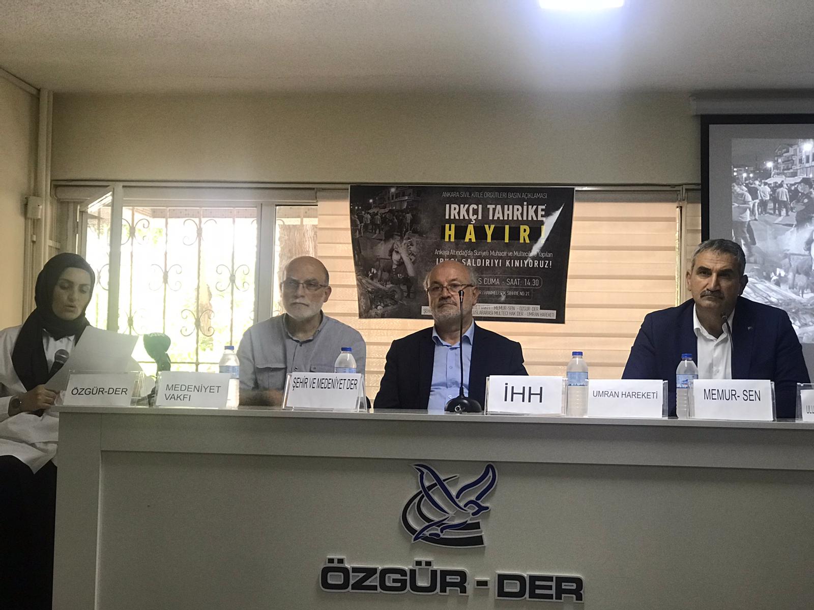 Ankara’nın Altındağ İlçesi'nde Suriyeli muhacir ve sığınmacılara ait ev ve işyerlerine yapılan ırkçı saldırılar, Ankara sivil kitle örgütleri tarafından Özgür-Der Ankara Şubesi'nde yapılan basın açıklamasıyla telin edildi.