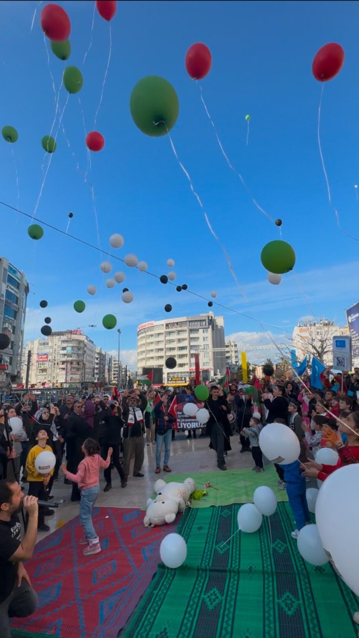 Konuşmaların ardından vatandaşlar, ellerindeki Filistin bayrağı renklerindeki balonları havaya uçururken Mustafa Nuhat Pektaş’ın gurupla birlikte attığı şu sloganları müteakip program sonlandı.
