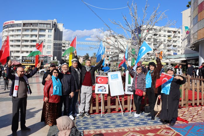 Muratpaşa ilçesinde bir alışveriş merkezinin önünde bir araya gelen Antalya Kudüs Platformu, kentteki STK üyeleri ve vatandaşlar ellerinde Türkiye, Filistin ve Doğu Türkistan bayrakları ile dövizler taşıdı.