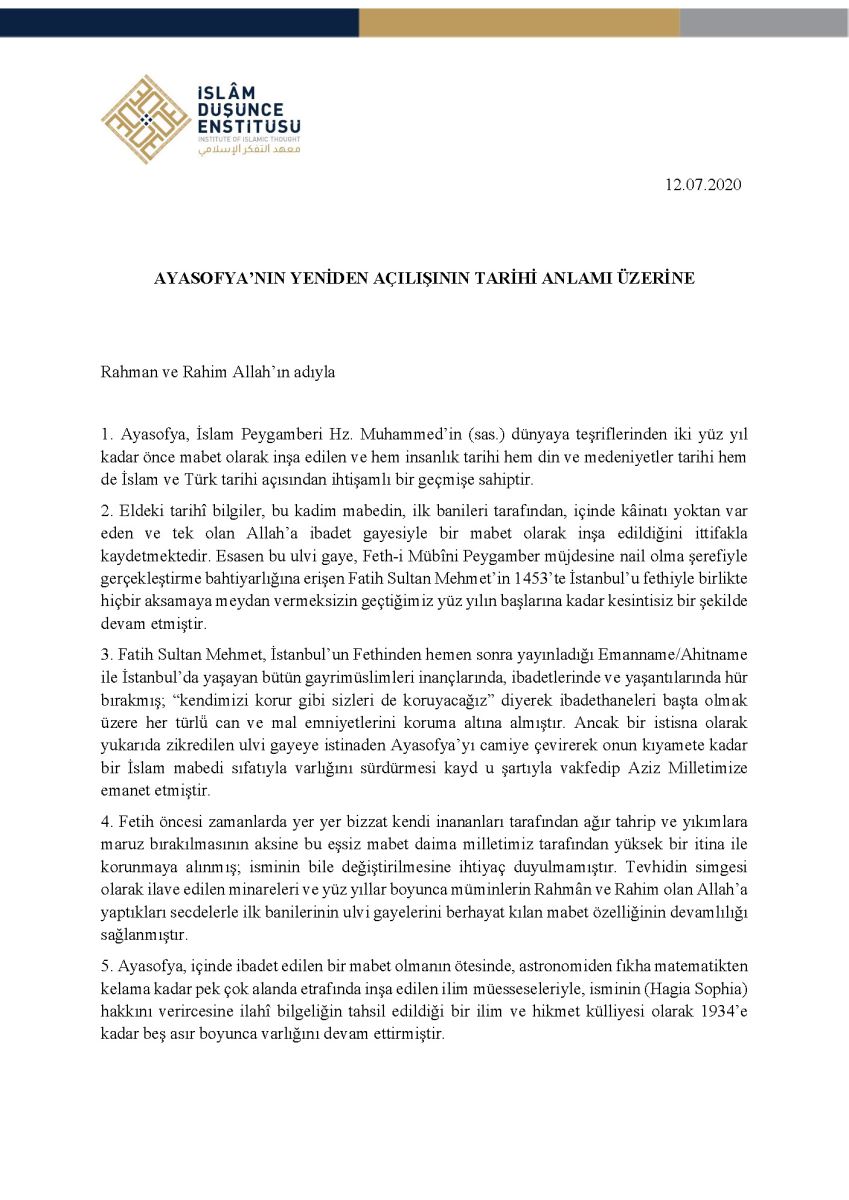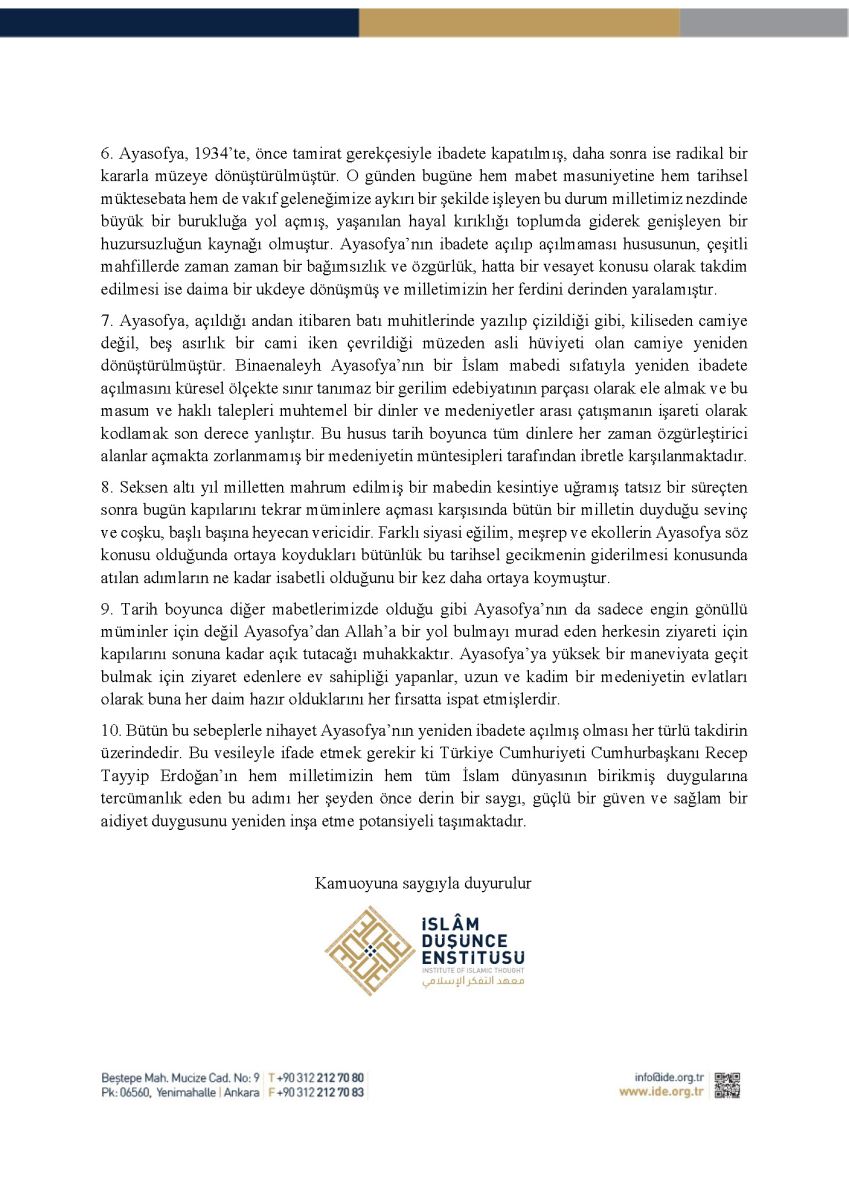 İslam Düşünce Enstitüsü tarafından yapılan açıklamada Ayasofya’nın “Tek olan Allah’a ibadet” gayesiyle inşa edildiği vurgulanarak özellikle Fetih’le birlikte ilave edilen minarelerle “Tevhid’in sembolü” olma vasfının teyid edildiği vurgulandı. 1934 senesinde Ayasofya’nın müzeye dönüştürülmesini mabedlerin dokunulmazlığına aykırı bir karar olarak değerlendiren açıklamada milletin duyduğu sevinç ve coşkuya dikkat çekildi.